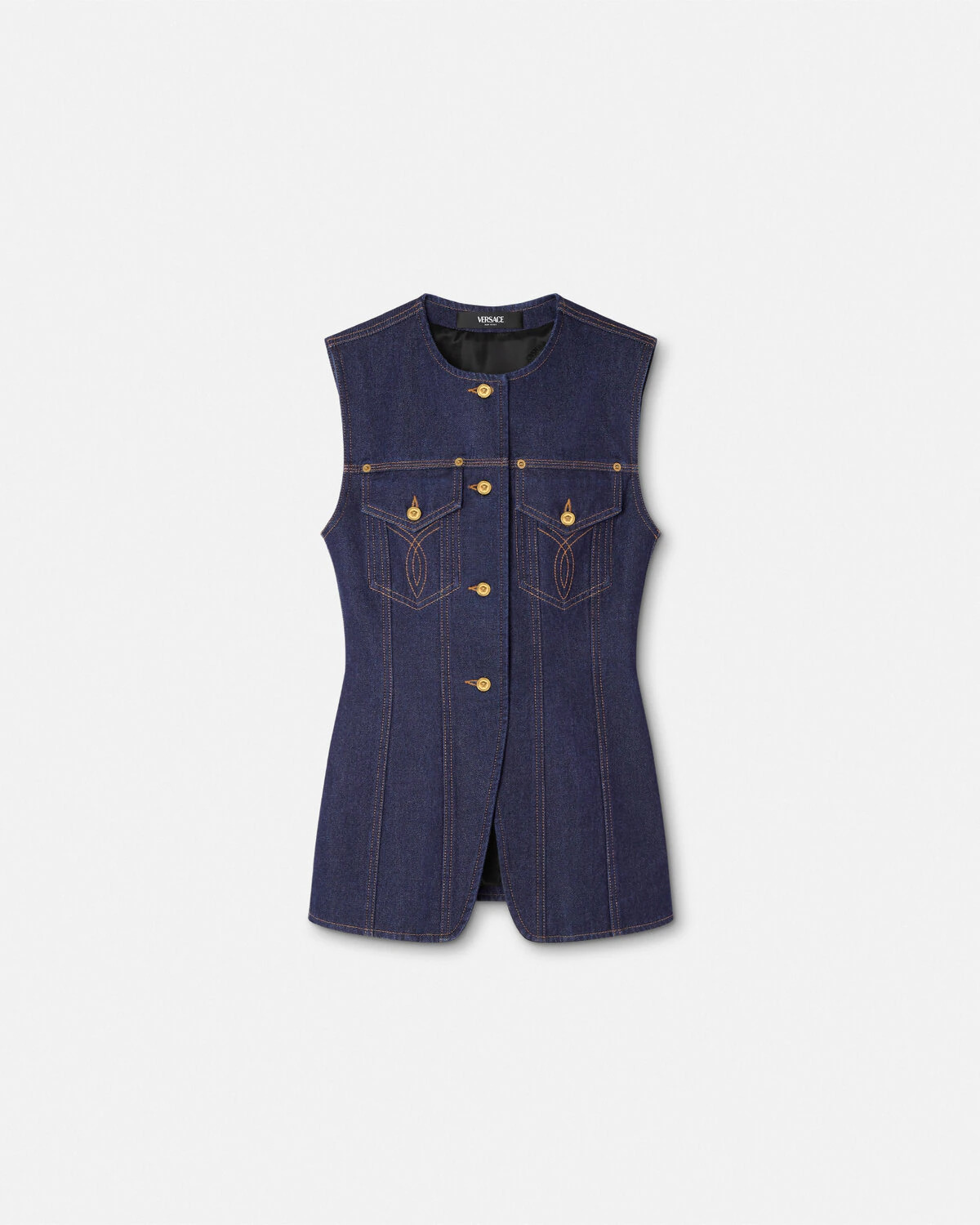 DETAILS A collarless singlebreasted fitted denim vest in a medium wash featuring accent Medusa buttons and front patch pockets - Medusa hardware - Sleeveless - Collarless - Front button closure - Chest patch pockets - Outer composition: 100% Cotton - Lining: 100% Cupro Item: 1020880-1A15341_1D920 SIZE & FIT - The model is 5'10" / 1.78 m tall and wears size 38 IT