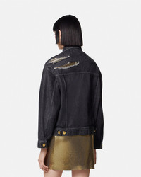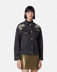 DETAILS A cotton denim jacket in a dark stonewashed finish with distressed details and metal mesh inserts The trucker style is detailed by accent Medusa buttons - Medusa hardware - Versace Logo leather patch - Long sleeves - Pointed collar - Front button closure - Front flap pockets - Side pockets - Outer composition: 100% Cotton - Trim 1: 100% Calf leather - Trim 2: 100% Metal Item: 1020893-1A14809_1D040 SIZE & FIT - The model is 5'10" / 1.78 m tall and wears size 38 IT