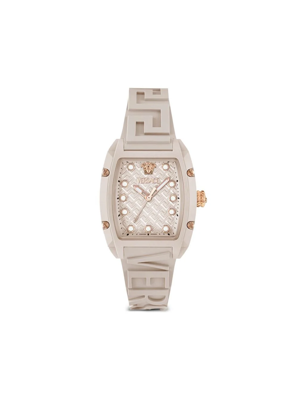 Dominus Lady 44mm Highlights - 44mm - Beige - Ceramic - Tonneau face - Geometric dial - Stick hands - Signature greca-pattern print - Medusa head motif - Quartz movement - Screw-down crown - Rubber strap - Pin-buckle fastening - This item comes with a standard one-year warranty from the boutique. Imported SIZE & FIT Measurement DIAMETER 17.6 in(44.7 cm)