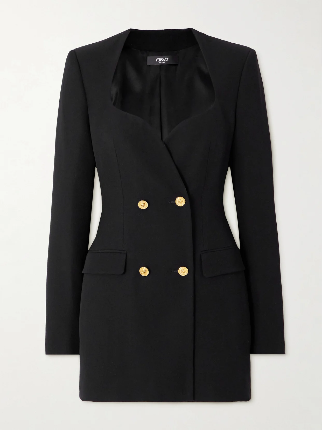 Versace's dress is modeled on classic double-breasted blazers. Tailored from grain de poudre wool, it has a sweetheart neckline and is darted along the waist. Match your jewelry to the gold-tone logo-embossed buttons.