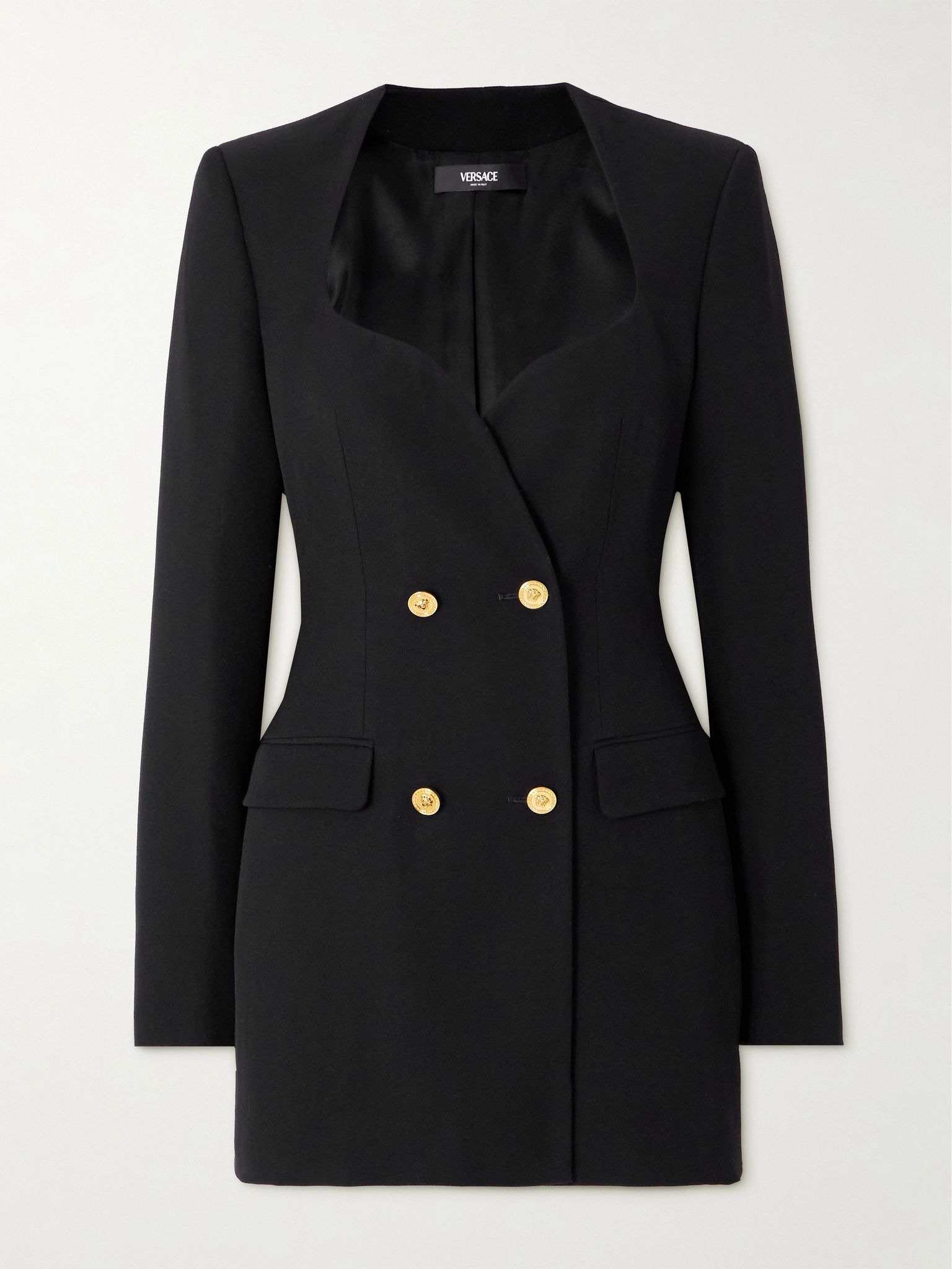Versace's dress is modeled on classic double-breasted blazers. Tailored from grain de poudre wool, it has a sweetheart neckline and is darted along the waist. Match your jewelry to the gold-tone logo-embossed buttons. Size & Fit - Fits true to size, take your normal size - Designed for a slim fit - Mid-weight, non-stretchy fabric - Model is 177cm/ 5'10" and is wearing an IT 40 Model measurements: - Bust: 86cm/ 34" - Waist: 65cm/ 25.5" - Hip: 90cm/ 35.5" Details & Care - Black grain de poudre wool - Button fastenings through double-breasted front - 100% wool; lining: 74% viscose, 26% polyester - Dry clean
