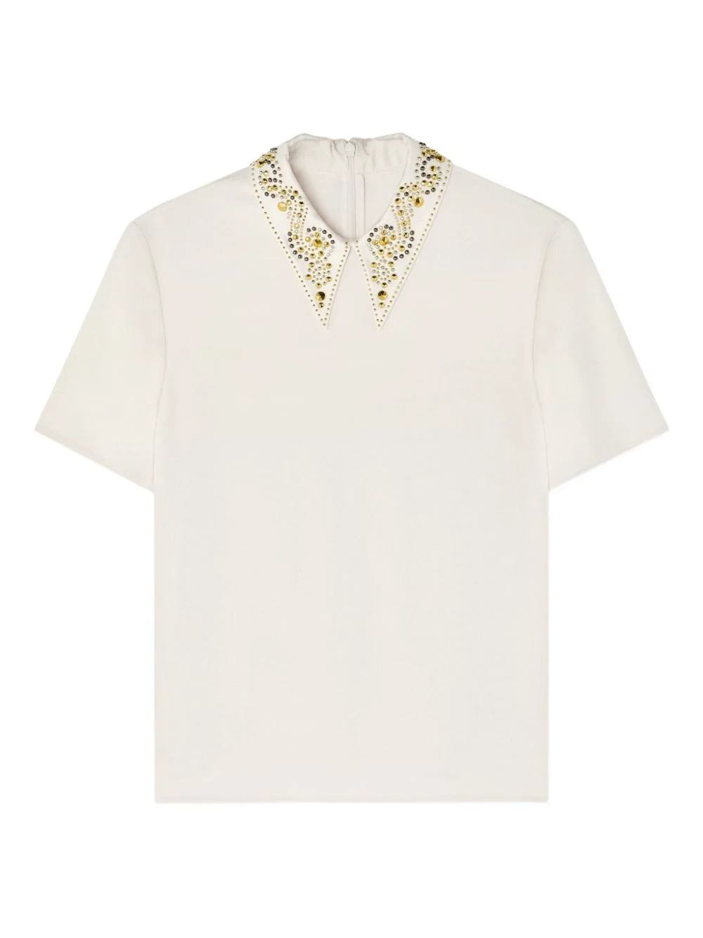 embellished-collar short-sleeve top Highlights - Off-white - Short sleeves - Pointed collar - Gold-tone embellishment Made in Italy Composition Acetate 74%, Viscose 26% Washing instructions Read Manufacturer Guidelines