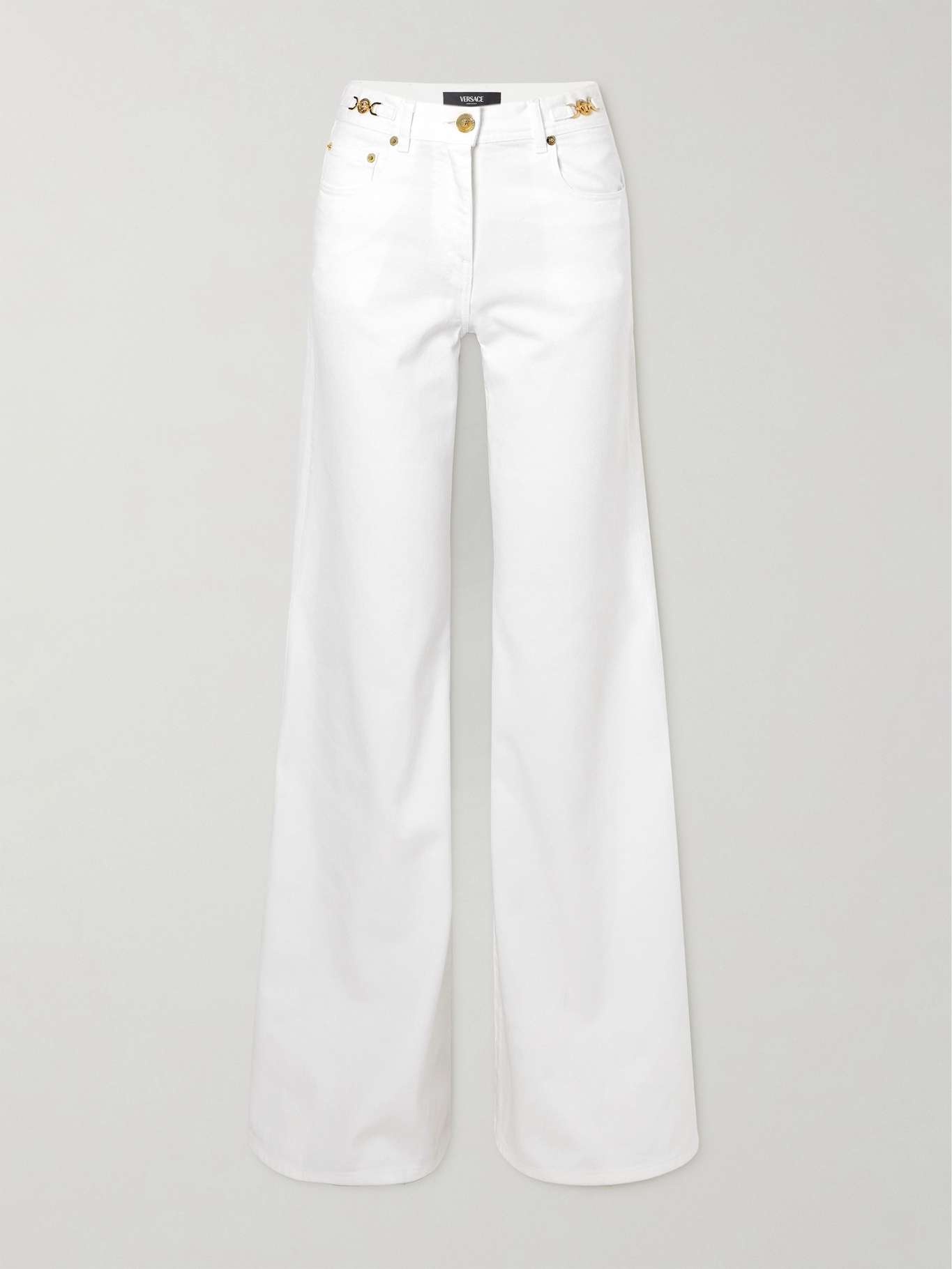 EDITORS'NOTES Versace often looks to the past for inspiration and these jeans are modeled after classic '70s styles. Cut from denim in a versatile white wash, they have exaggerated flared legs and signature gold-tone 'Medusa' plaques at the waistband. SIZE & FIT Model measurements: - Fits true to size, take your normal size - High-rise, designed for a slim fit with a flared hem - Mid-weight, non-stretchy denim - Model is 175cm/ 5'9" and is wearing a size 26 - Bust: 78cm/ 30.7" - Waist: 62cm/ 24.4" - Hip: 92cm/ 36" DETAILS & CARE - White denim - Button and concealed zip fastening at front - 100% cotton