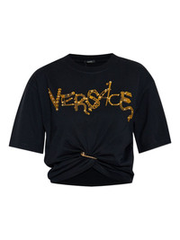 embellished knot-detail T-shirt Highlights - Black - Gold-tone embellishments - Knot detail - Short sleeves - Round neck - Medusa-head clasp Imported Composition Cotton 100% Washing instructions Read Manufacturer Guidelines