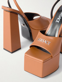 Versace's square-toe sandals radiate retro appeal. Set on a towering block heel balanced by a sturdy platform, they've been made in Italy from smooth leather and feature the silver-tone logo plaque along the wide strap. Fans of the brand will spot the signature 'Medusa' charm decorating the ankle strap and sole.