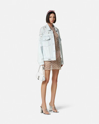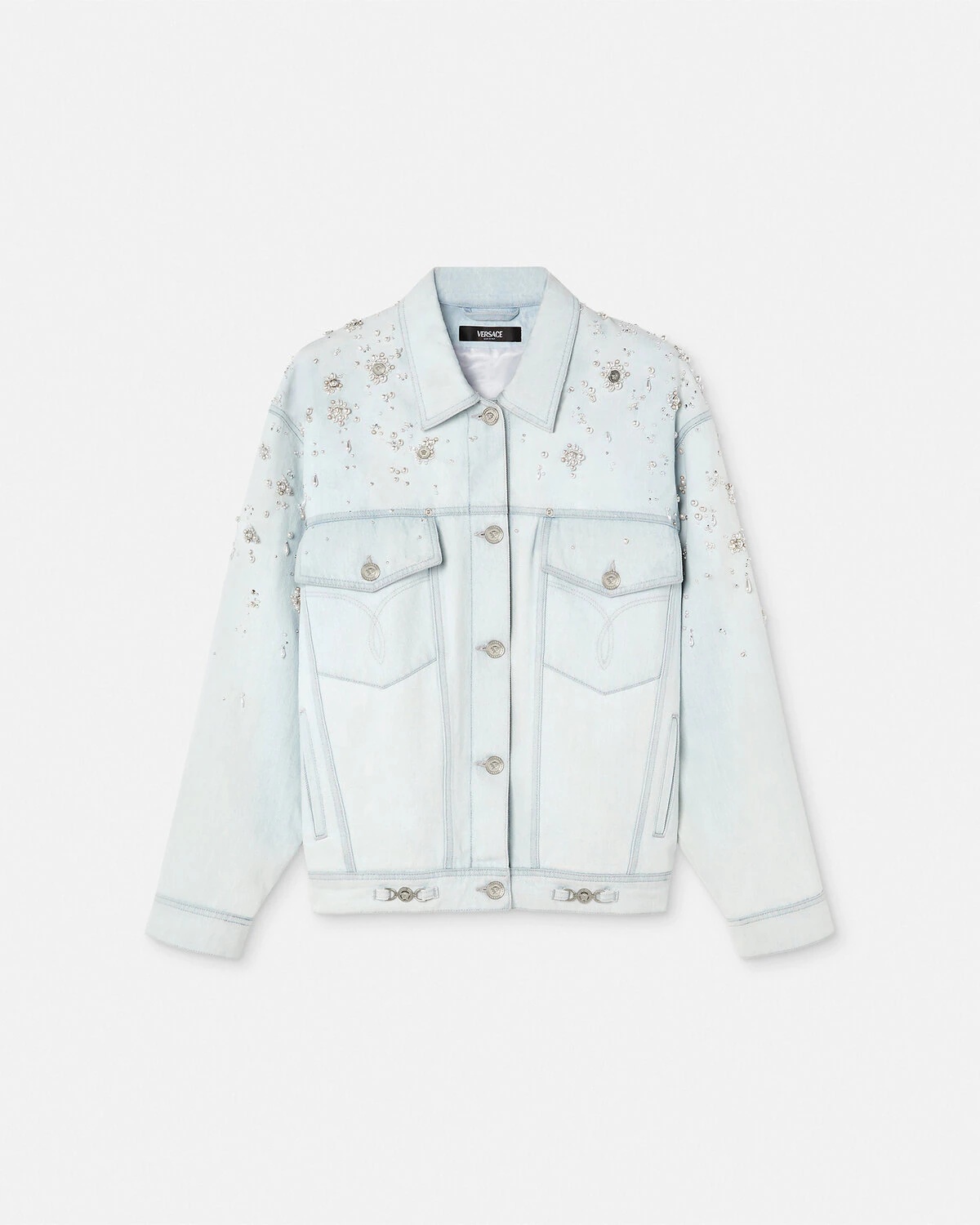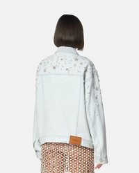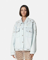 DETAILS This oversized denim jacket in a light-wash finish is detailed with drop pearl, beads, and metal Medusa embroideries. The style is complete with Medusa '95 buckle accents at the waist and a leather logo patch at the back. - Medusa hardware - Medusa '95 hardware - Versace logo patch - Pearl and bead embellishments - Long sleeves - Front button closure - Chest flap pockets - Side pockets - Outer composition: 100% Cotton - Lining: 74% Viscose, 26% Polyester - Trim: 100% Calf leather Item: 1015103-1A10575_1D700 SIZE & FIT - The model is 1,80 m tall and wears size 38 - All sizes fit Italian standards