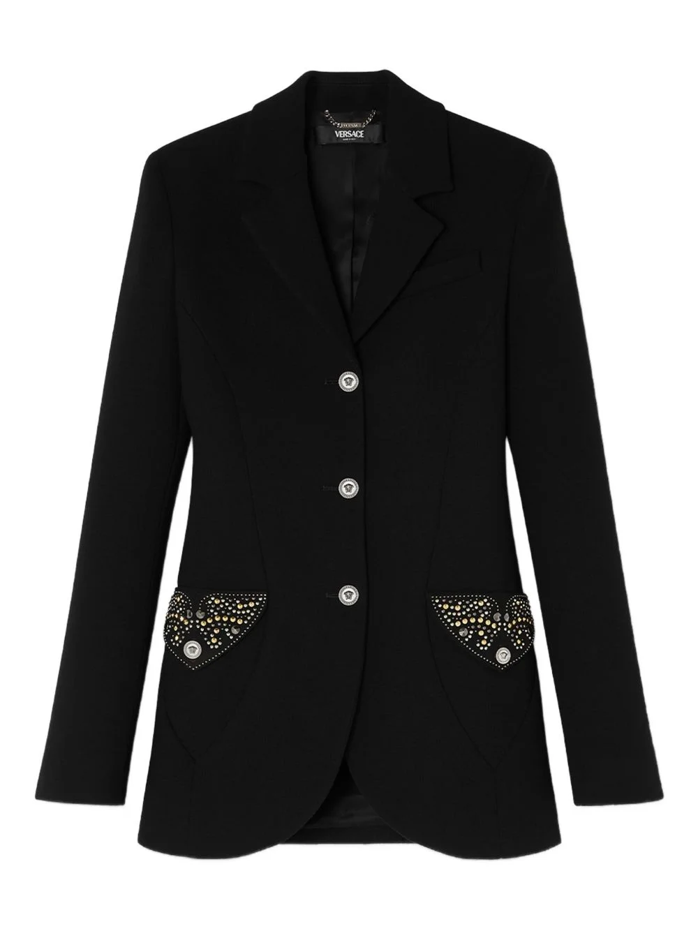 embellished pocket wool jacket Highlights - Black - Wool fabric - Crystal embellishment - Flap pockets - Button fastening - Notched lapel Imported Composition Virgin Wool 100% Washing instructions Read Manufacturer Guidelines