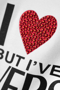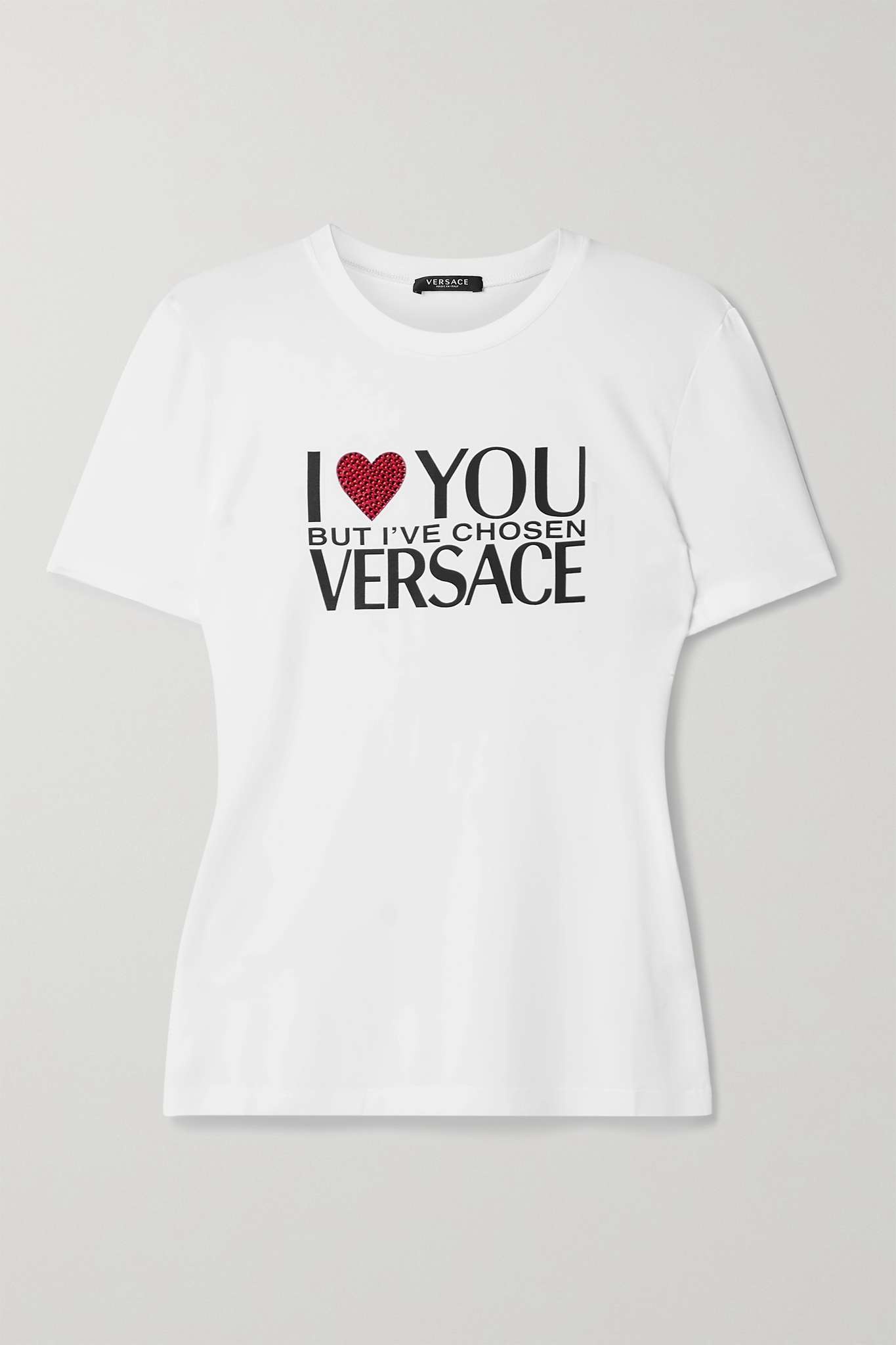 EDITORS'NOTES Versace's T-shirt is a playful way to show your loyalty for the house. Cut from soft stretch-jersey, it's printed with a phrase of adoration across the chest and encrusted with sparkling crystals. Style yours alone or under a blazer. SIZE & FIT - DETAILS & CARE - White, black and red stretch-jersey - Slips on - 95% viscose, 5% elastane - Hand wash