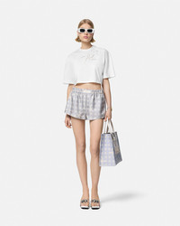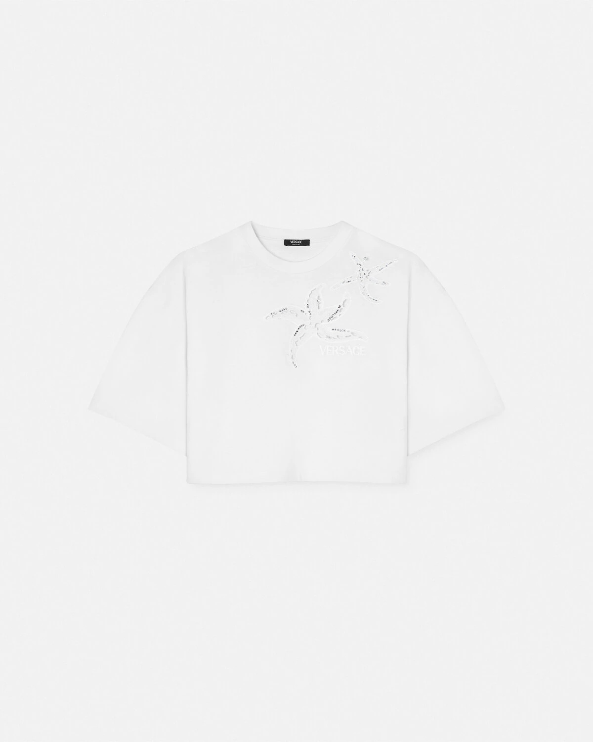 DETAILS A cropped short-sleeved cotton jersey T-shirt featuring crystal- and paillettes-embellished starfish, and Versace logo embroideries. - Starfish embroidery - Versace logo embroidery - Crystal and paillettes embellishments - Short sleeves - Crewneck - Outer composition: 100% Cotton - Embroidery: 60% RCF, 20% Polyester sequins, 20% Glass - Trim 1: 100% Polyester - Trim 2: 100% Cotton Item: 1016907-1A11606_1W000 SIZE & FIT - The model is 5'10" tall and wears size 38 IT