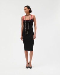 A sleeveless midi dress crafted from stretch cotton jersey, featuring contrasting trims and a thread-embroidered Versace Logo at the back. - Versace Logo embroidery - Sleeveless - Shoulder straps - Round neckline - Slip on - Outer composition: 96% Cotton, 4% Elastane - Embroidery: 100% Polyester - Trim: 100% Cotton Size & Fit - The model is 5'10" / 1.78 m tall and wears size 38 IT Item: 1024684-1A17889_2BQ30