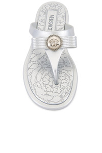 Details - Metallic laminated TPU upper with TPU sole - Slip-on with T-bar design; no buckles or laces - Gianni Ribbon bow detail at vamp, accented with central Medusa hardware - All-over Barocco engraving on the sole, showcasing iconic Versace aesthetic - Round toe - Made in Italy - Our Style No. VSAC-WZ154 - Manufacturer Style No. 1018789_1A14478