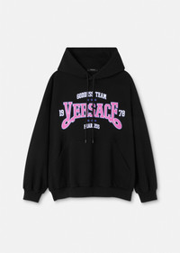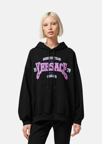 This cotton jersey hooded sweatshirt features a varsity-inspired Versace logo with a "Goddess Team" and "Fearless" slogan. DETAILS & CARE - Versace logo print - Long sleeves - Drawstring Hood - Kangaroo pouch - Elasticized hem and cuffs - Outer composition: 100% Cotton - Trim: 100% Cotton - Machine wash cold (delicate) - Do not bleach - Do not tumble dry - Cool iron on reverse with damp cloth on top - Do not dry clean - wash inside out SIZE & FIT - The model is 5'8" tall and wears size 38 - All sizes fit Italian standards