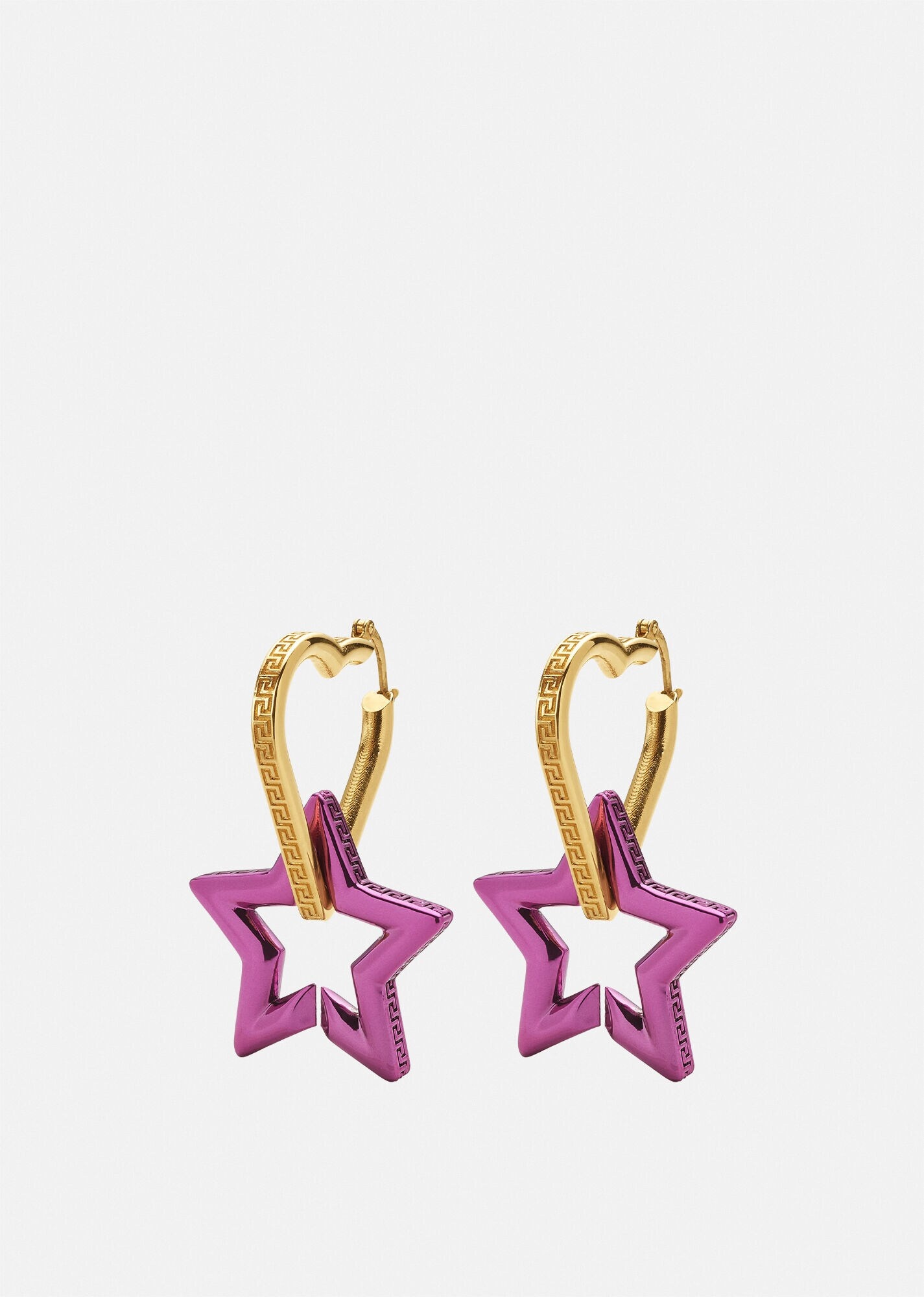 Chunky chain drop earrings with Greca-engraved heart hoops and star charms. All Versace jewelry products are lead and nickel free. All materials are hypoallergenic. DETAILS & CARE - Greca engraving - Star drop charms - Hinge clasp closure - Outer composition: 100% Metal