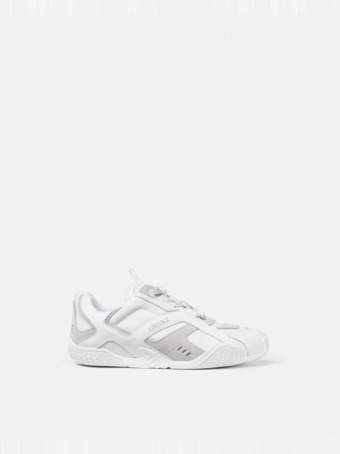 DETAILS This innovative shoe combines the agility of a boxing shoe with the power of a racing shoe Its thin versatile rubber outsole features a repeated Greca pattern The sleek last ensures a comfortable fit while the mix of calf leather suede and technical fabric provides flexibility and structure - Galaxia Logo on insole - Versace Logo embossing on tongue and heel counter - Greca motif on outsole - Greca pull tab on tongue - Low-top - Lace-up - Round toe - Outer composition: 100% Calf leather - Lining: 91% Polyester, 9% Calf leather - Trim 1: 100% Calf leather - Trim 2: 100% Nylon - Sole: 100% Rubber Item: 1019007-1A12892_2PX60 SIZE & FIT - The shoe weighs approximately 14.1 oz / 0.4 kg for the model size 44 IT