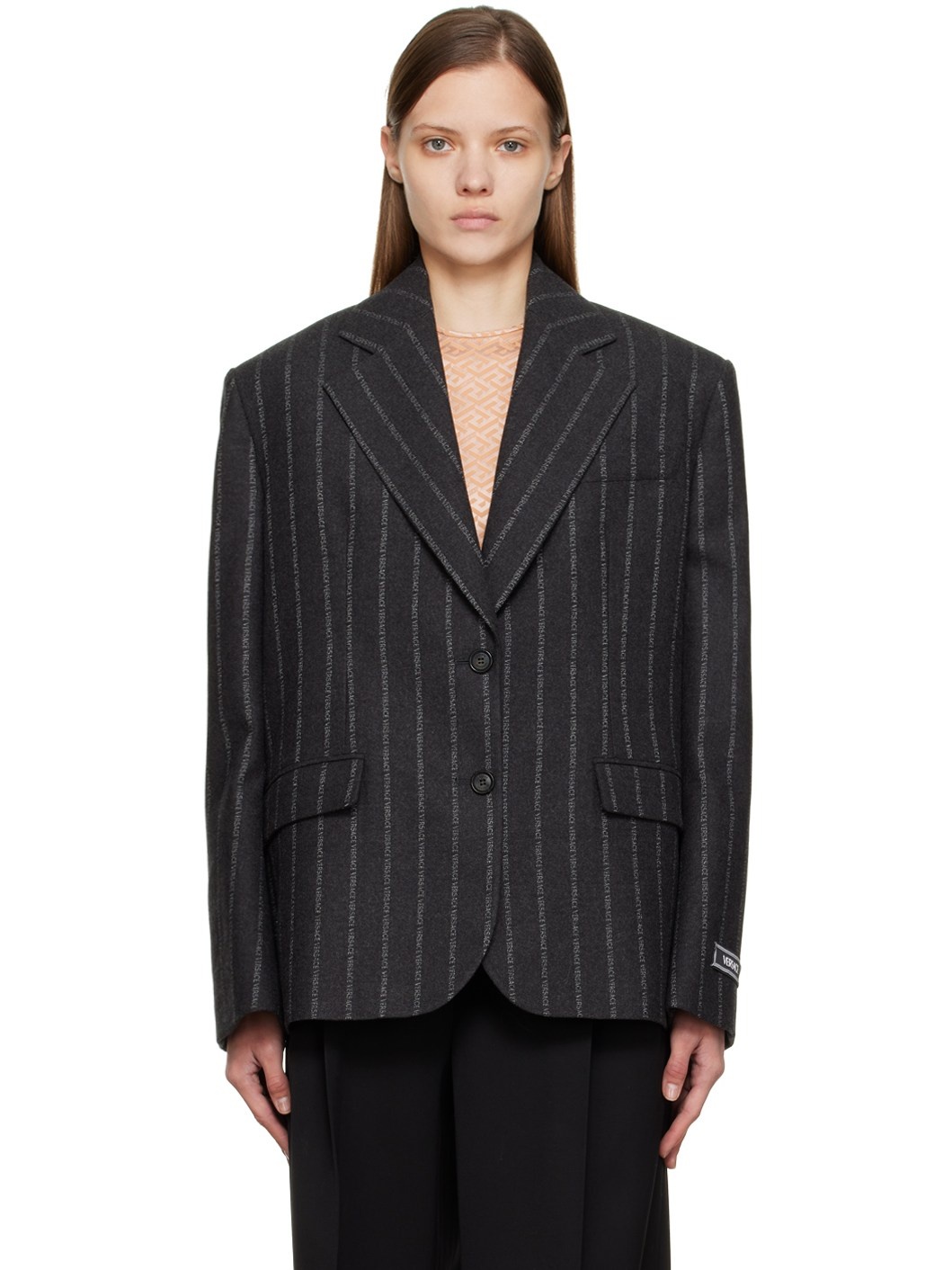 Brushed virgin wool blazer. Logo woven throughout. · Notched lapel · Button closure · Welt pocket at chest · Flap pockets · Three-button surgeon's cuffs · Logo patch at cuff · Welt pockets at interior · Full satin lining Supplier color: Medium grey Body: 96% virgin wool, 4% wool. Lining 1: 100% cupro. Lining 2: 100% cupro.