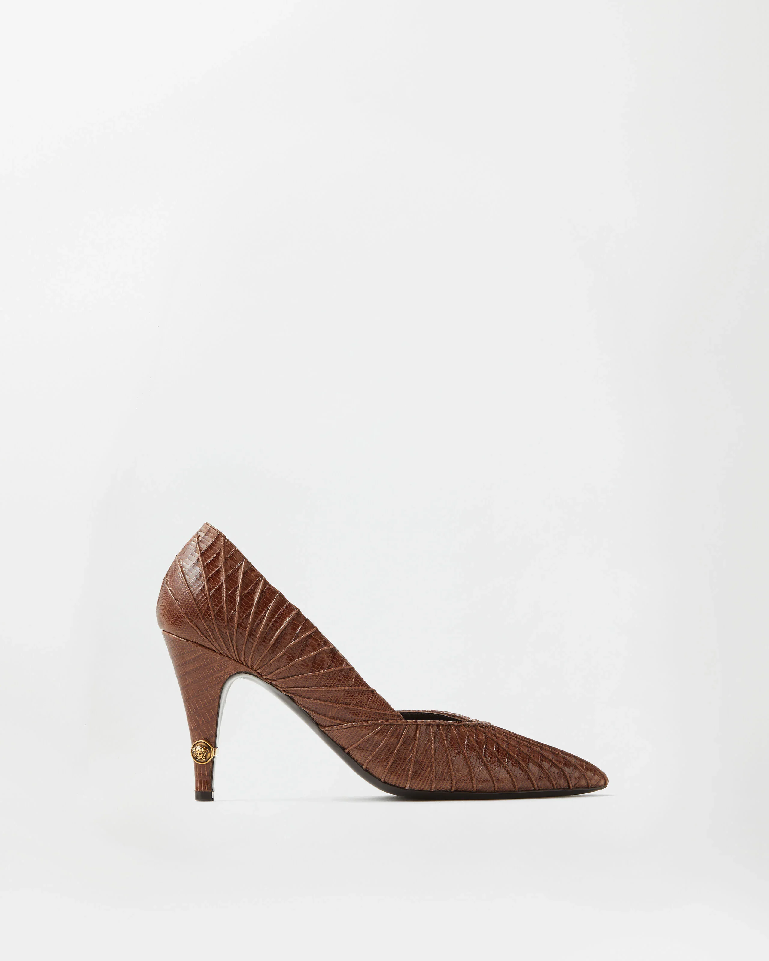 The Gianni pumps, drawn from the Gianni Versace archives, are crafted from tejus leather in a textured 'pinched and stitched' technique with a deep vamp. Heels are decorated with a bejeweled ring featuring a 3D Medusa hardware. - Medusa hardware - Pointed toe - Heels - Outer composition: 100% Tejus Leather - Lining: 100% Goat Leather - Sole: 100% Calf Leather Size & Fit - Heel: 9 cm - Fit is true to size, we recommend taking your normal size - Footbed: Regular Item: 1023837-1A18071_1NH4J