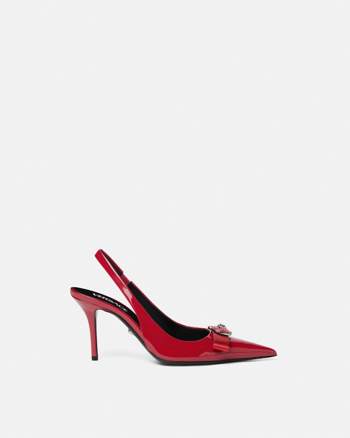 DETAILS Sharppointed toe pumps in patent leather featuring a slingback strap stiletto heels and a the archival nastro Gianni bow with Medusa hardware - Medusa hardware - Slingback strap - Pointed toe - Stiletto heels - Outer composition: 100% Calf leather - Lining 1: 100% Lambskin - Lining 2: 100% Goat leather - Sole: 100% Calf leather - Trim: 64% Viscose, 25% Silk, 11% Lambskin Item: 1013717-1A08983_1RB3P SIZE & FIT - The shoe weighs approximately 1 oz / 0.03 kg for the model size 40 IT - Heel: 3.3" / 8.5 cm