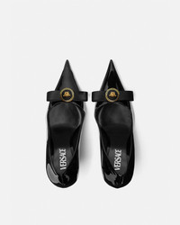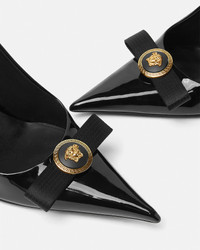 Sharp-pointed toe pumps in patent leather featuring stiletto heels and a signature Medusa bow at the front with the archival 'nastro Gianni' stitching. - Medusa hardware - Pointed toe - Stiletto heels - Outer composition: 100% Calf leather - Lining 1: 100% Lambskin - Lining 2: 100% Goat leather - Sole: 100% Calf leather - Trim: 72% Viscose, 28% Silk Size & Fit - The shoe weighs approximately 10.6 oz / 0.3 kg for the model size 40 IT - Heel: 4.3" / 11 cm Item: 1012494-1A08983_1B00V