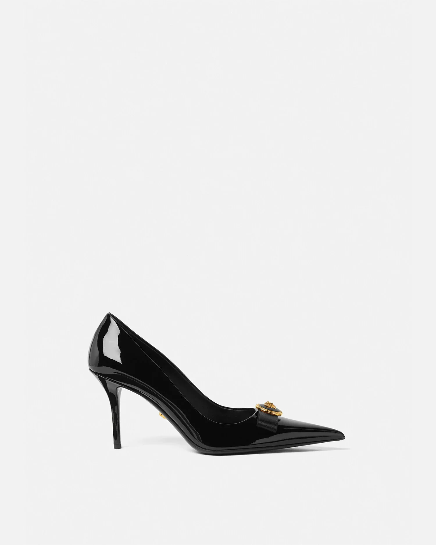High-heeled pumps crafted from patent leather with 'nastro Gianni' bow and Medusa hardware at the front. - Medusa '95 hardware - Pointed toe - High heel - Outer composition: 100% Calf leather - Lining 1: 100% Lambskin - Lining 2: 100% Goat leather - Trim: 72% Viscose, 28% Silk - Sole: 100% Calf leather Size & Fit - Heel: 3.3" / 8.5 cm Item: 1013083-1A08983_1B00V