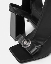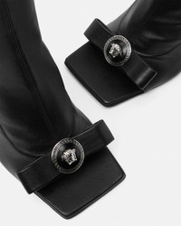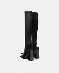 DETAILS Knee-high boots in stretch and supple, grained, nappa leather. The pair is set on high block heels and features peep-toes with the 'nastro Gianni' bow and Medusa signifiers, an expression of the House’s heritage and craft. - Medusa hardware - Open square toe - Open heel - High block heel - Side zip closure - Outer composition: 100% Lambskin - Lining 1: 100% Goat leather - Lining 2: 100% Lambskin - Sole: 100% Calf leather - Trim: 100% Lambskin Item: 1014607-1A03984_1B00P SIZE & FIT - The shoe weighs approximately 14 oz / 0.4 kg for the model size 38 IT - Heel: 4.1" / 10.5 cm