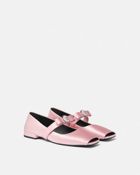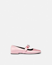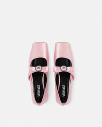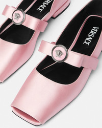 DETAILS Satin Gianni Ribbon ballerina flats with squared open toes, and accent Medusa hardware at the front with a tonal enamel finish to match the uppers. - Medusa hardware - Open square toes - Outer composition: 72% Viscose, 28% Silk - Lining 1: 100% Goat leather - Lining 2: 100% Lambskin - Sole: 100% Calf leather - Trim: 72% Viscose, 28% Silk Item: 1014359-1A00619_1PG4P SIZE & FIT - The shoe weighs approximately 10.6 oz for the model size 38 - Heel: 0.8"