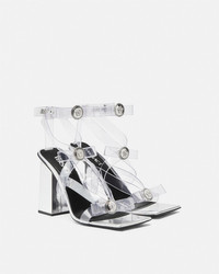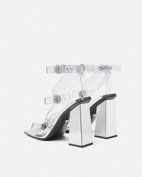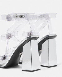 DETAILS These Gianni Ribbon sandals are set on metallic high-block heels and are made from transparent PVC. In a cage-like construction, Medusa hardware accents the ankle strap and front bows. - Medusa hardware - Square toe - Adjustable strap - Press closure - High block heel - Outer composition: 100% Polyvinylchloride - Lining: 100% Goat leather - Trim: 100% Calf leather - Sole: 100% Calf leather Item: 1014871-1A10007_2T08P SIZE & FIT - The shoe weighs approximately 14 oz / 0.4 kg for the model size 38 IT - Heel: 4.1" / 10.5 cm