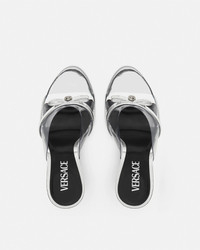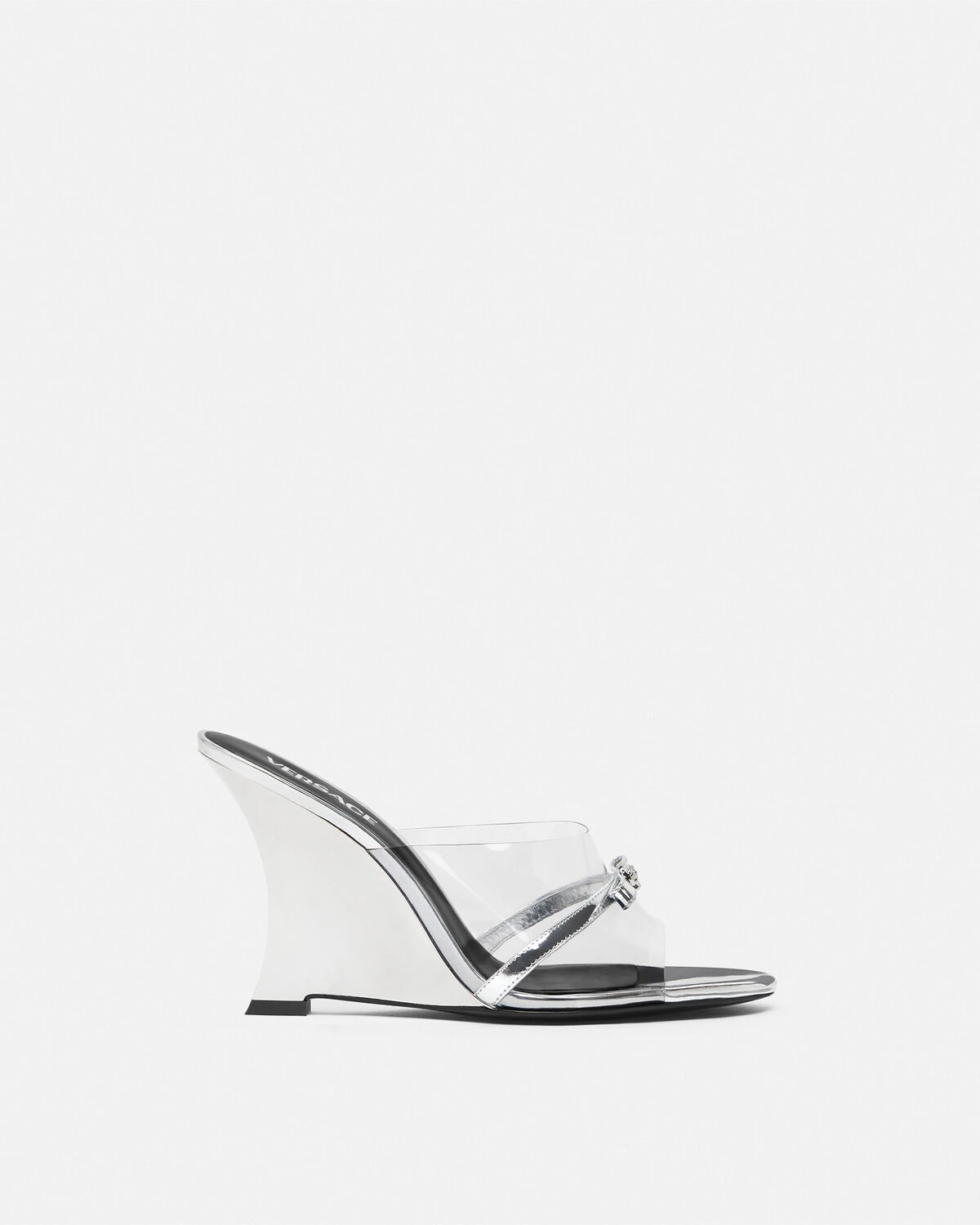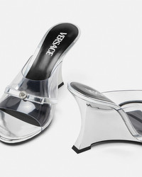 DETAILS These slip-on Gianni Ribbon mules have a galvanised metallic wedge and feature transparent PVC uppers. The pair is accented by a Medusa hardware on the micro, upper bow. - Medusa - Open toe - Slip on - Curved wedge - Outer composition: 100% Calf leather - Lining 1: 100% Lambskin - Lining 2: 100% Goat leather - Trim: 100% Polyvinylchloride - Sole: 100% Calf leather Item: 1016196-1A10007_2T08P SIZE & FIT - The shoe weighs approximately 7.6 oz / 217 g for the model size 39 IT - Heel: 3.7" / 9.5 cm - Footbed: Slim - Fits small, we recommend taking half a size up