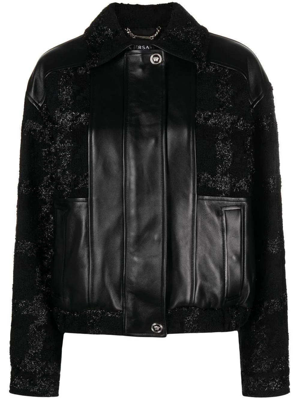glittered leather bomber jacket Highlights - Black - Lambskin - Virgin wool blend - Panelled design - Oversized pointed collar - Signature medusa head buttons - Two side slit pockets - Long sleeves - Buttoned cuffs Made in Italy Composition Outer: Lamb Skin 100%, Virgin Wool 40%, Viscose 29%, Metallized Polyamide 26%, Cotton 3%, Polyamide 2% Lining: Cupro 100% SIZE & FIT Model measurements Height 5 ft 10 in(1.77 m) Bust/Chest 32.67 in(83 cm) Hips 35.43 in(90 cm) Waist 23.62 in(60 cm) FittingInformation Designed to be unstructured, offering a loose fit throughout The elasticated waist allows for a comfortable fit Made from a midweight non-stretch fabric This piece fits true to size – take your usual size Washing instructions Do Not Wash/Do Not Dry Clean