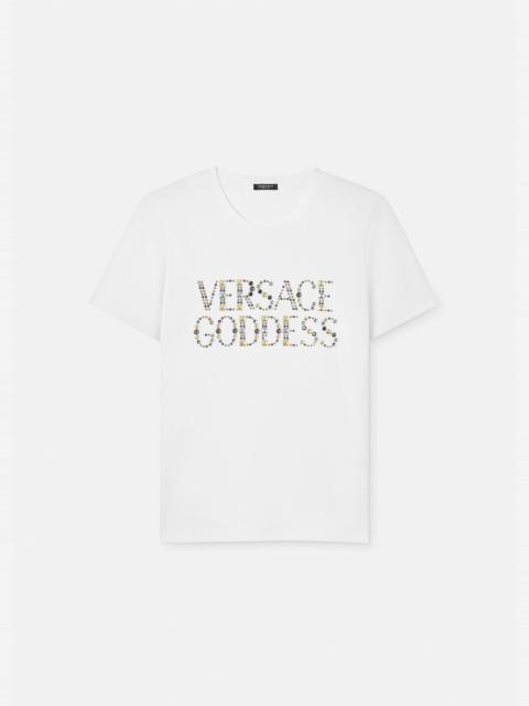 Made from cotton in a slim fit, this short-sleeved crewneck T-shirt is detailed with a studded Versace Goddess logo at the front. DETAILS & CARE - Versace Goddess logo - Spikes, studs and crystal embellishments - Short sleeves - Crewneck - Outer composition: 100% Cotton - Wash in cold water - Do not bleach - Do not tumble dry - Cool iron on reverse with damp cloth on top - Do not dry clean - Wash separately and inside out SIZE & FIT - The model is 5'8" ft tall and wears size 38 IT - All sizes fit Italian standards