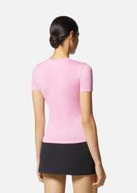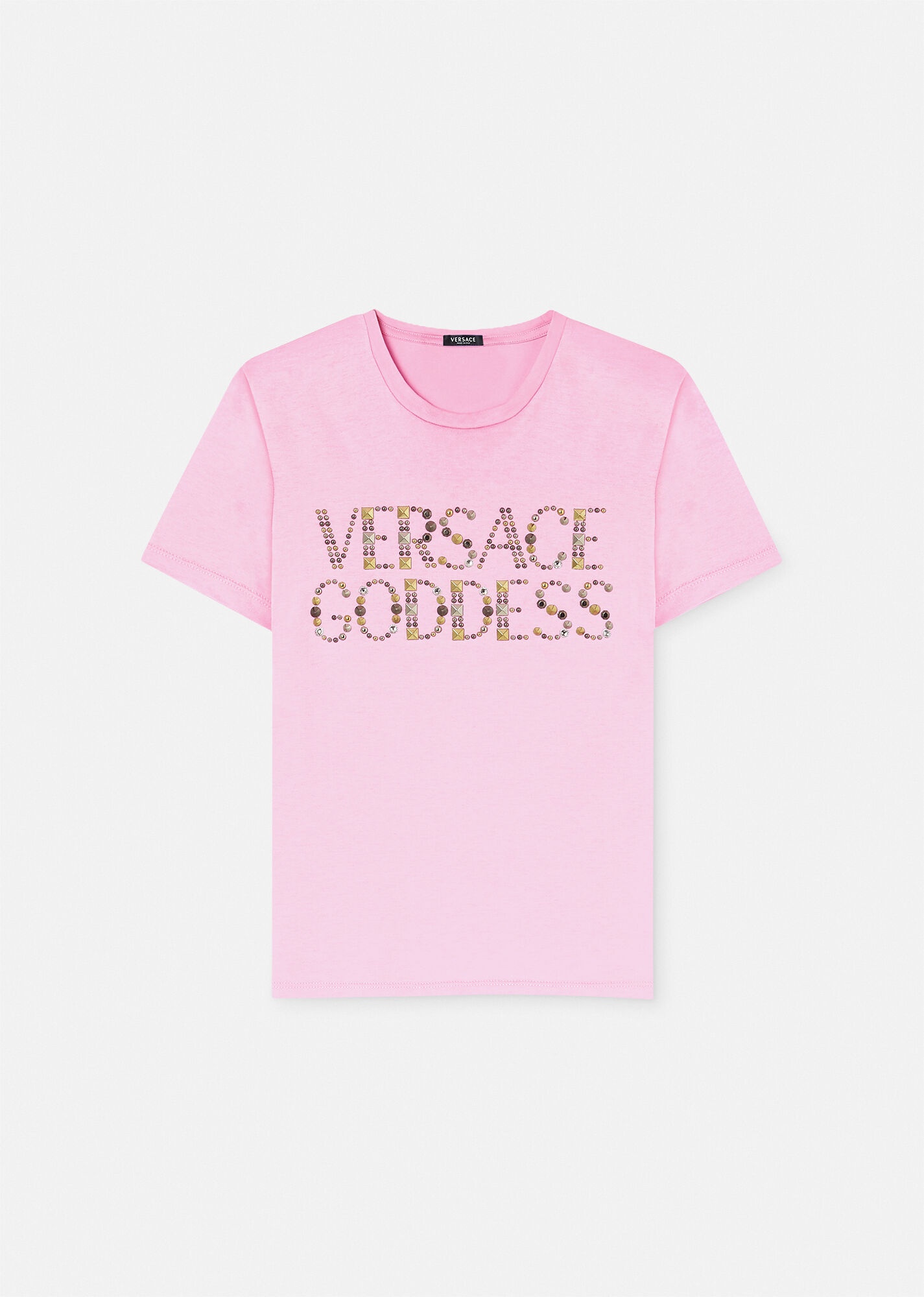 Made from cotton in a slim fit, this short-sleeved crewneck T-shirt is detailed with a studded Versace Goddess logo at the front. DETAILS & CARE - Versace Goddess logo - Spikes, studs and crystal embellishments - Short sleeves - Crewneck - Outer composition: 100% Cotton - Wash in cold water - Do not bleach - Do not tumble dry - Cool iron on reverse with damp cloth on top - Do not dry clean - Wash separately and inside out SIZE & FIT - The model is 5'8" ft tall and wears size 38 IT - All sizes fit Italian standards