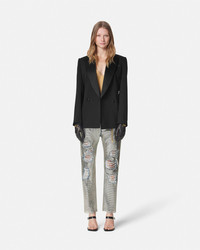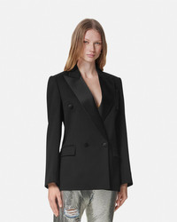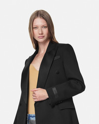 DETAILS A doublebreasted tuxedo blazer in a straight masculine fit crafted from stretchwool grain de poudre The sartorial style is detailed by satintrimmed peaked lapels and buttons padded shoulders and a tonal tailoring label one sleeve A full tonal jacquard Barocco lining completes the design - Tailoring label - Barocco lining - Long sleeves - Peaked lapels - Chest welt pocket - Front flap pockets - Buttoned cuffs - Back vent - Outer composition 1: 98% Pure virgin wool, 2% Elastane - Outer composition 2: 78% Silk, 22% Polyester - Lining: 58% Cupro, 42% Viscose Item: 1016708-1A12258_1B000 SIZE & FIT - The model is 5'8" / 1.75 m tall and wears size 38 IT