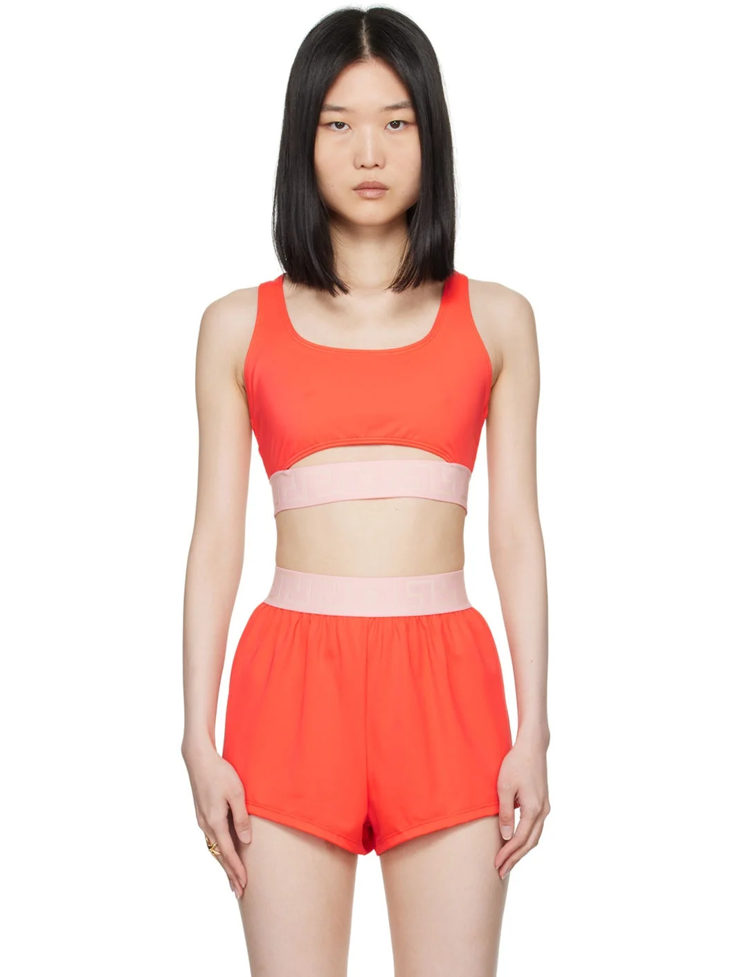 Stretch nylon jersey bikini top. · Scoop neck · Cutout at front · Jacquard logo at elasticized hem · Fixed shoulder straps · Criss-crossing straps at back · Partially lined Supplier color: Coral Body: 78% polyamide, 22% elastane. Trim: 82% polyester, 9% polyamide, 9% elastane. Lining: 78% polyamide, 22% elastane. Made in Italy 242653F105021