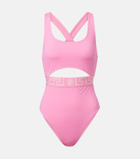 Your next getaway is glamorous with this swimsuit from Versace. The design features alluring cutouts and boasts the brand’s iconic Greca Border along the waist. Product Details - Material: 78% nylon (recycled), 22% elastane - Care instructions: hand wash - Made in Italy - Designer color name: Guava - Item color: pink - Details: 82% polyester, 9% nylon, 9% polyamide - Lining: 78% nylon, 22% elastane - Item number: P01069637 Size & Fit - True to size - Elasticated waist - Minimal coverage - High-cut leg - The model seen in the picture is 178cm-5'10" and wearing a size 1
