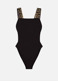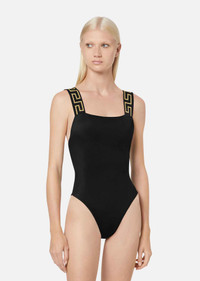 Square front, low back, one-piece swimsuit with statement band straps featuring Greca and Medusa motifs. DETAILS & CARE - Outer Fabric: 78% Nylon, 22% Elastane - Lining: 78% Nylon, 22% Elastane - Do not iron - Delicate dry clean - Machine wash cold (delicate) - Do not bleach - Do not tumble dry - Made in Italy SIZE & FIT - All sizes fit Italian standards - The Model is 1,75 m and wears a size 1
