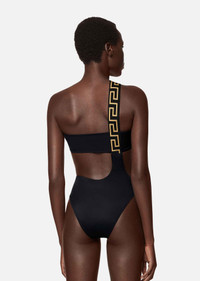 A confidence-inducing beach or pool design, this asymmetric swimsuit channels the inherent Versace sensuality. The bold design is embellished with a diagonal Greca shoulder strap. DETAILS & CARE - Diagonal Greca shoulder strap - Waist and back cut-outs - High leg - Outer Fabric: 78% Nylon 22% Elastane - Lining: 78% Nylon 22% Elastane - Hand wash gently using mild detergent - Do not bleach - Do not tumble dry - Do not iron - Delicate dry clean - Made in Italy SIZE & FIT - All sizes fit Italian standards - The model is 1,8 m tall and wears a size 1