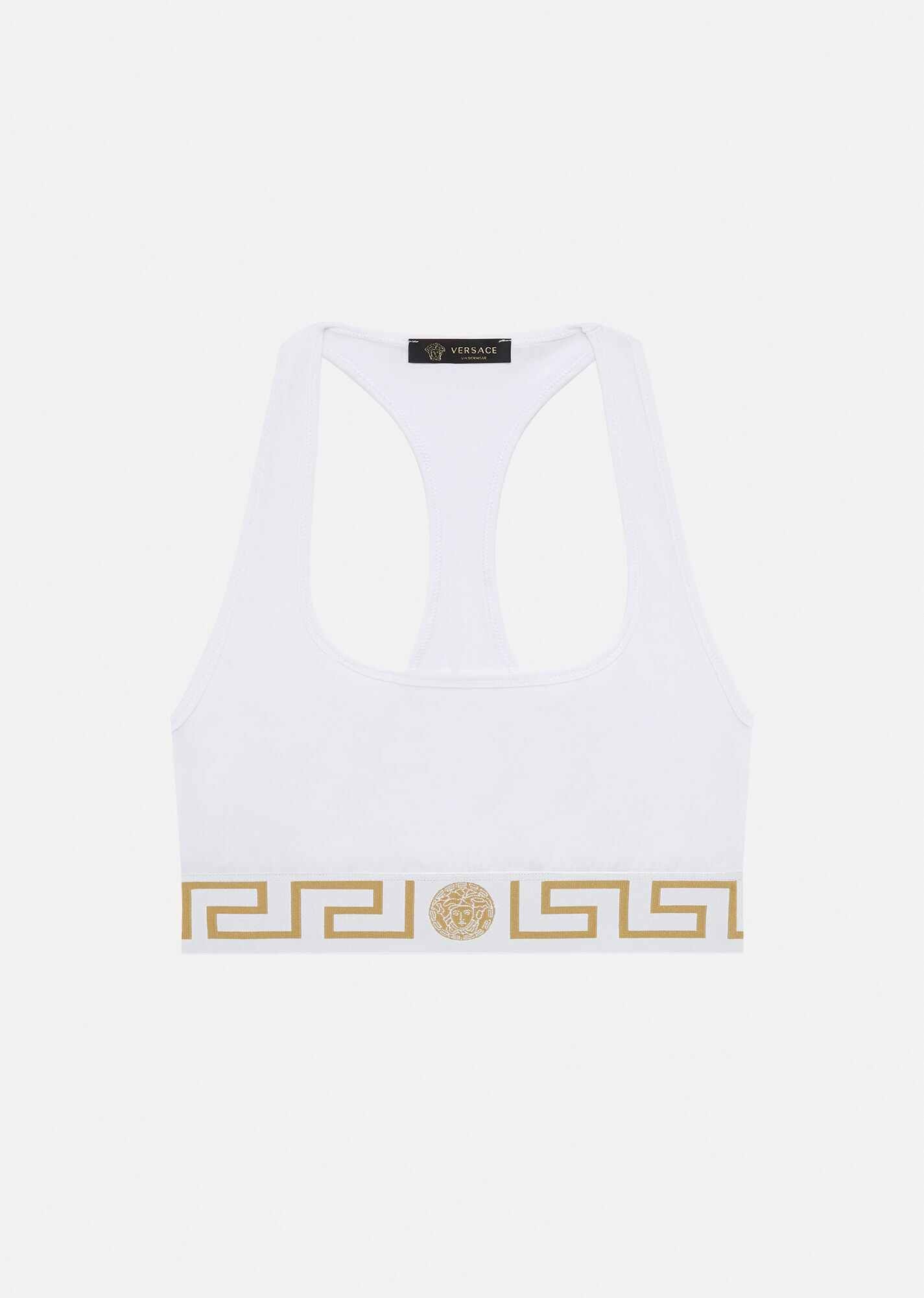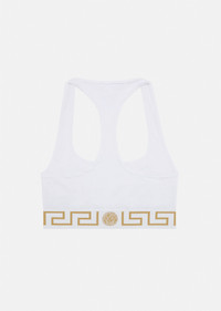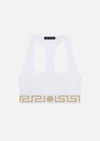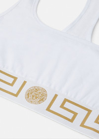 Rounded square neck sports bra, with statement Greca Border banding and racer back. DETAILS & CARE - Square neck - Racer back - Medusa - Greca border - Outer Fabric: 94% Cotton, 6% Elastane - Lining: 82% Nylon, 18% Elastane - Cool iron - Hand wash gently using mild detergent - Delicate dry clean - Do not bleach - Do not tumble dry - Imported SIZE & FIT - All sizes fit Italian standards