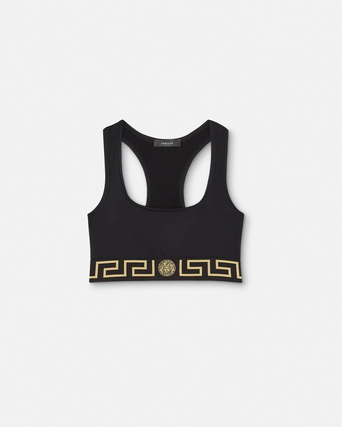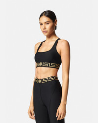 DETAILS This gym sports bra with a scoop neckline features the signature Greca border with a central Medusa motif on the elasticized waistband. - Logo motif - Sleeveless - Scoop neckline - Outer composition: 61% Nylon, 39% Elastane - Lining: 94% Nylon, 6% Elastane - Trim: 82% Polyester, 9% Elastane, 9% Nylon - Fabric made using GRS-certified recycled polyester and nylon Item: 1004104-1A06229_1B000