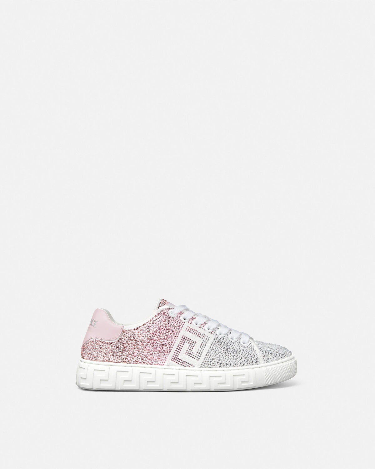 DETAILS These lowtop sneakers are characterised by an engraved Greca pattern on the soles and feature allover crystalembellishments on the uppers in degrad colors A foil Versace logo details the heel counter - Greca motif - Crystal embellishments - Low-top - Lace-up - Round toe - Logo patch at the tongue - Logo on heel counter - Outer composition: 72% Viscose, 28% Silk - Lining: 100% Polyester - Trim: 100% Nylon - Sole: 100% Thermoplastic polyurethane Item: 1013568-1A13090_2WL90 SIZE & FIT - The shoe weighs approximately 17.6 oz / 0.5 kg for the model size 37 IT