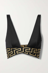 EDITORS'NOTES Versace's bikini top is instantly recognizable thanks to the gold 'Greca' motif along the underband. It's made from smooth stretch fabric and has high apex triangle cups and an artfully twisted front. Wear yours with the matching briefs. SIZE & FIT - 1 = XS - 2 = S - 3 = M - 4 = L - 5 = XL - Fits true to size, take your normal size - Model is 180cm/ 5’11”, bra size 34B and is wearing the designer's size 1 DETAILS & CARE - Black stretch-polyamide, black and gold jacquard - Slips on - 78% polyamide, 22% elastane - Hand wash - Lotion, sunscreen, oil and chlorine can cause discoloration of this item; this is not a manufacturing defect. Please follow care instructions to keep your swimwear in the best condition