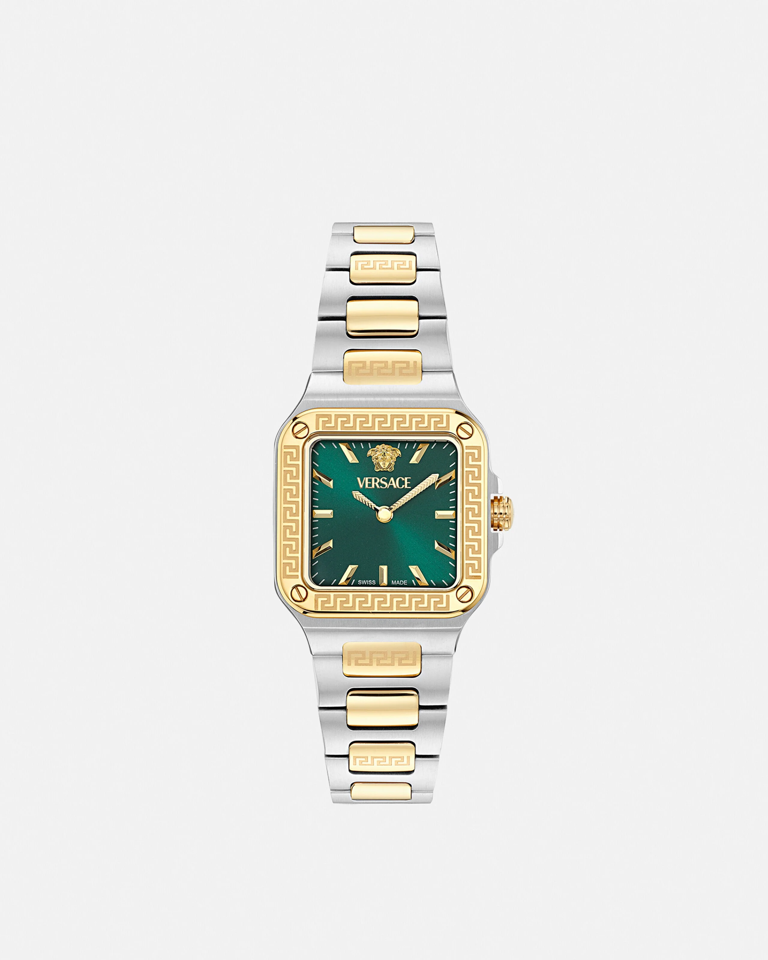 Greca Edge is a declaration of intent: bold, architectural and unmistakably Versace. Its square case, defined by engraved Greca motif and polished screws, articulates strength and precision, echoing the discipline of classical architecture. Beneath its geometry, a glimmering sunray dial softens its rigor with resplendent light. The Medusa dominates at 12 o'clock. All Versace watches are guaranteed by the 'Swiss Made' marking. All stainless steel is recycled. - SWISS MADE - Sapphire Crystal - Case: Bicolor (SS&IP2N) case - Dial: Green sunray dial with decorative screws and Greca on the top ring / Medusa and Versace Logo at 12h - Bracelet: Bicolor (SS&IP2N) band with butterfly buckle and Greca motif - Movement: RONDA 762.3 Swiss Quartz 2-hands movement - Water Resistant: 5 ATM Size & Fit - Case: 1.2x1.2" / 30-30 mm Item: PVE5G003-P0026_RTU_TU_PNUL__