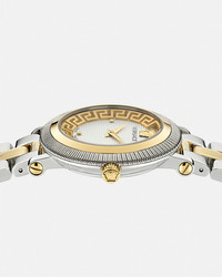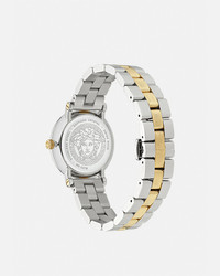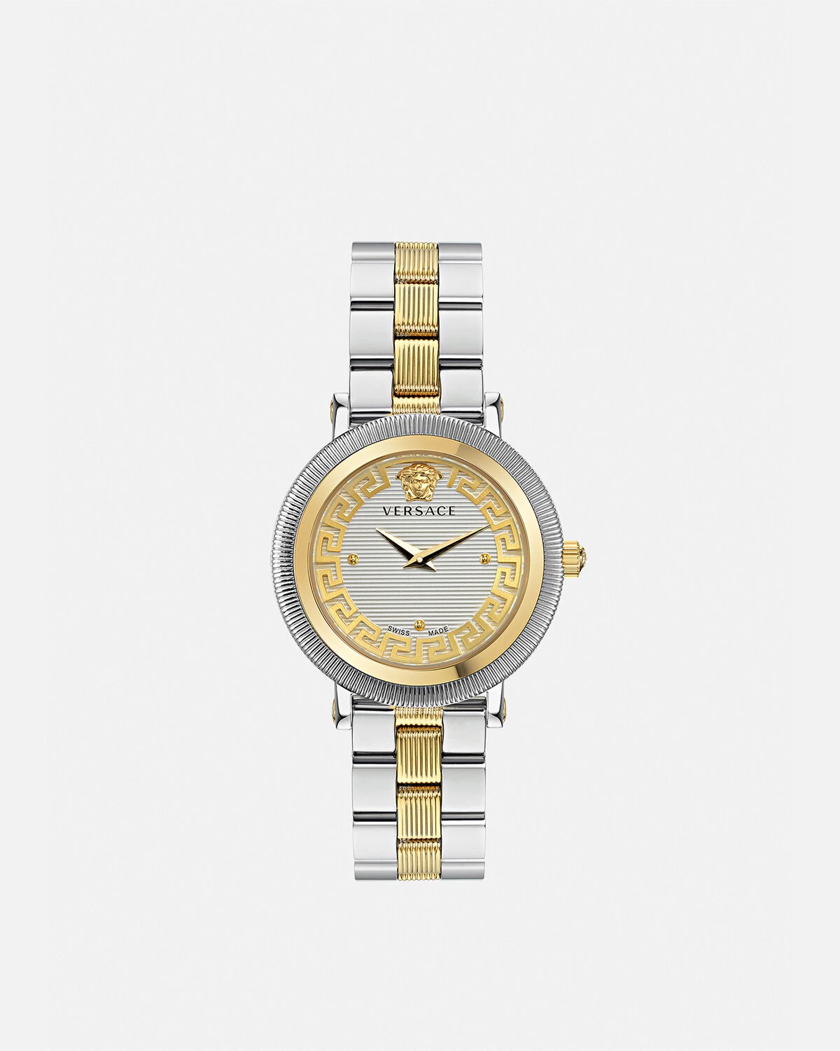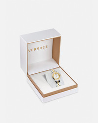 DETAILS An elegant case with signature Versace codes including a small three-dimensional Medusa at 12 o'clock and a lug Greca pattern on the inner dial. The timepiece is complete with a metal bracelet with horizontal textured links. All Versace watches are guaranteed by the 'Swiss Made' marking. - Case: Bico (SS&IP2N) case - Dial: White-Silver dial with 3D Greca on the inner dial / Versace logo and Medusa at 12h - Bracelet: Bico (SS&IP2N) band with butterfly buckle - Movement: RONDA 762.3 Swiss Quartz 2-hands movement - Water Resistant: 5 ATM Item: PVE7F004-P0023_RTU_TU_PNUL__ SIZE & FIT - Case: 1.4"