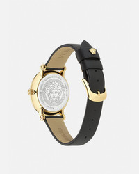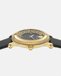 DETAILS An elegant case with signature Versace codes including a small three-dimensional Medusa at 12 o'clock and a lug Greca pattern on the inner dial. The timepiece is complete with a grained leather bracelet. All Versace watches are guaranteed by the 'Swiss Made' marking. - Case: IP2N case - Dial: Black dial with 3D Greca pattern on the inner dial / Versace logo and Medusa at 12h - Bracelet: Black genuine leather strap with tongue buckle - Movement: 762.3 Swiss Quartz 2-hands movement - Water Resistant: 5 ATM Item: PVE7F003-P0023_RTU_TU_PNUL__ SIZE & FIT - Case: 1.4"