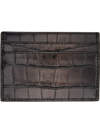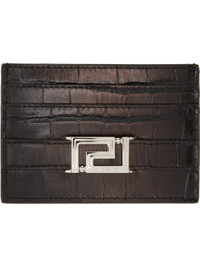 Croc-embossed calfskin card holder in tones of brown. · Signature Greek key hardware at face · Four card slots · Central note slot · Grained leather lining · Silver-tone hardware · H2.75" x W4" Supplier color: Soil/Palladium