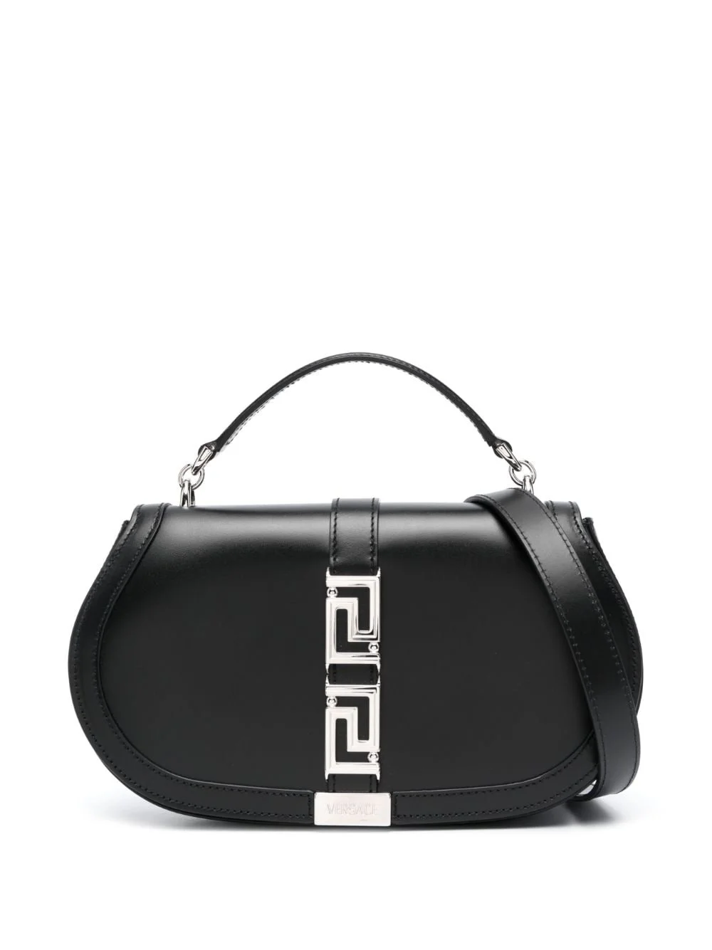 Greca Goddess leather shoulder bag Palladium-toned Greca hardware decorates this Versace Greca Goddess shoulder bag for an instantly recognisable look. Crafted from smooth black calf leather, it boasts a curved silhouette and a detachable shoulder strap for a handheld alternative. Highlights - Black - Calf leather - Smooth grain - Palladium-tone hardware - Signature greca detailing - Single flat top handle - Adjustable detachable shoulder strap - Foldover top with magnetic fastening - Internal slip pocket Made in Italy Composition Outer: Calf Leather 100%, Metal 100% SIZE & FIT Model measurements Height 5 ft 11 in(1.8 m) Bust/Chest 34.25 in(87 cm) Hips 35.82 in(91 cm) Waist 24.8 in(63 cm) Measurement DEPTH 2.36 in(6 cm) HANDLE 2.75 in(7 cm) HEIGHT 5.51 in(14 cm) STRAP 19.68 in(50 cm) WIDTH 10.23 in(26 cm)