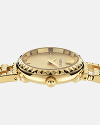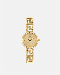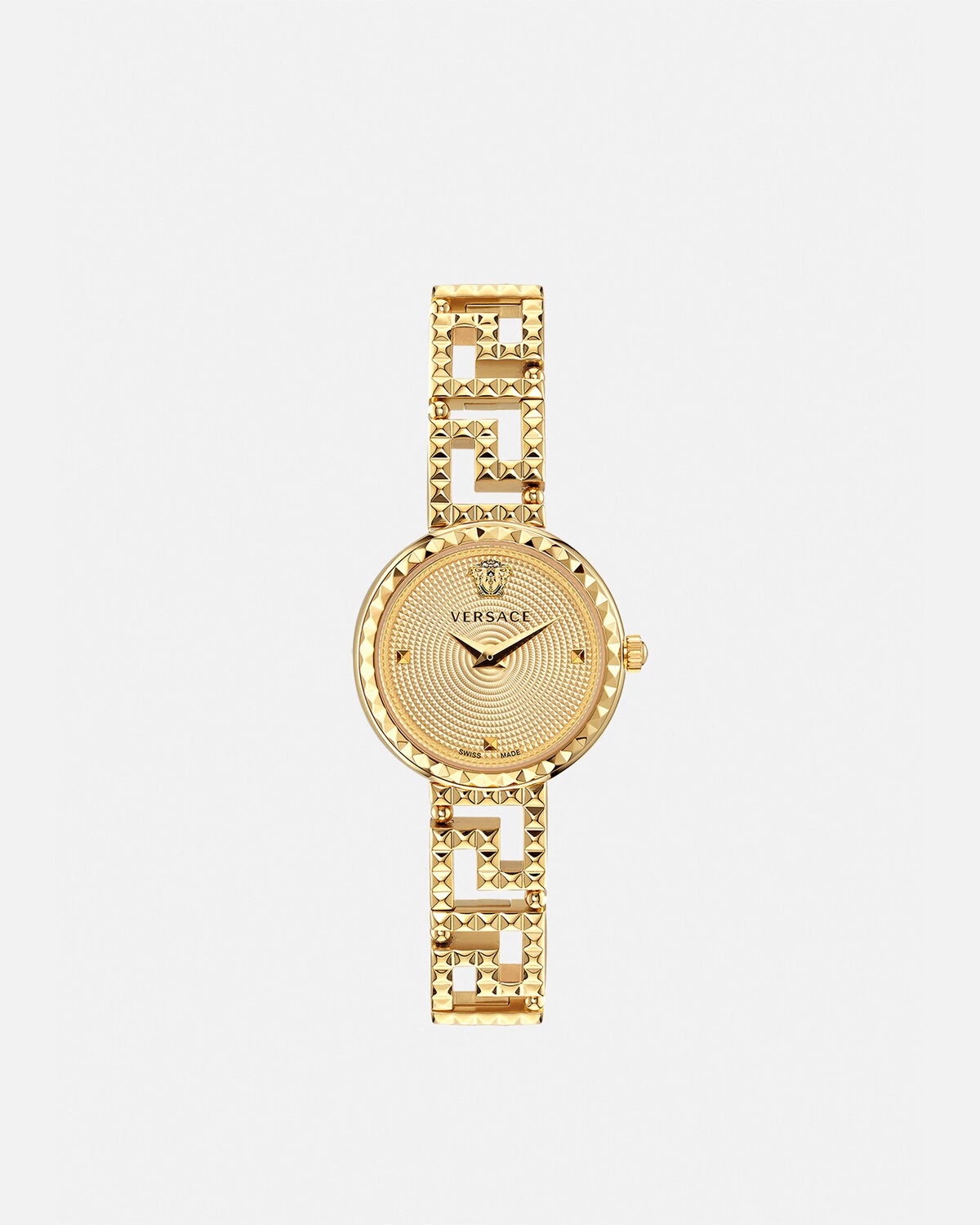 DETAILS An elegant jewellery timepiece characterised by a Greca bracelet with studs. The case is detailed with a three-dimensional Medusa at 12 o'clock. All Versace watches are guaranteed by the 'Swiss Made' marking. - Case: IP2N case with studs on the top ring - Dial: Gold-tone dial with Versace logo and Medusa at 12h / Stud indexes at 3h, 6h, and 9h - Bracelet: IP2N Greca bracelet with studs and butterfly buckle - Movement: RONDA 1032.3 Swiss Quartz 2-hands movement - Water Resistant: 5 ATM Item: PVE7A003-P0023_RTU_TU_PNUL__ SIZE & FIT - Case: 1.1"