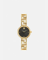 DETAILS An elegant jewellery timepiece characterised by a Greca bracelet with studs. The case is detailed with a three-dimensional Medusa at 12 o'clock. All Versace watches are guaranteed by the 'Swiss Made' marking. - Case: IP2N case with studs on the top ring - Dial: Black dial with Versace logo and Medusa at 12h / Stud indexes at 3h, 6h, and 9h - Bracelet: IP2N Greca bracelet with studs and butterfly buckle - Movement: RONDA 1032.3 Swiss Quartz 2-hands movement - Water Resistant: 5 ATM Item: PVE7A004-P0023_RTU_TU_PNUL__ SIZE & FIT - Case: 1.1"