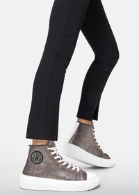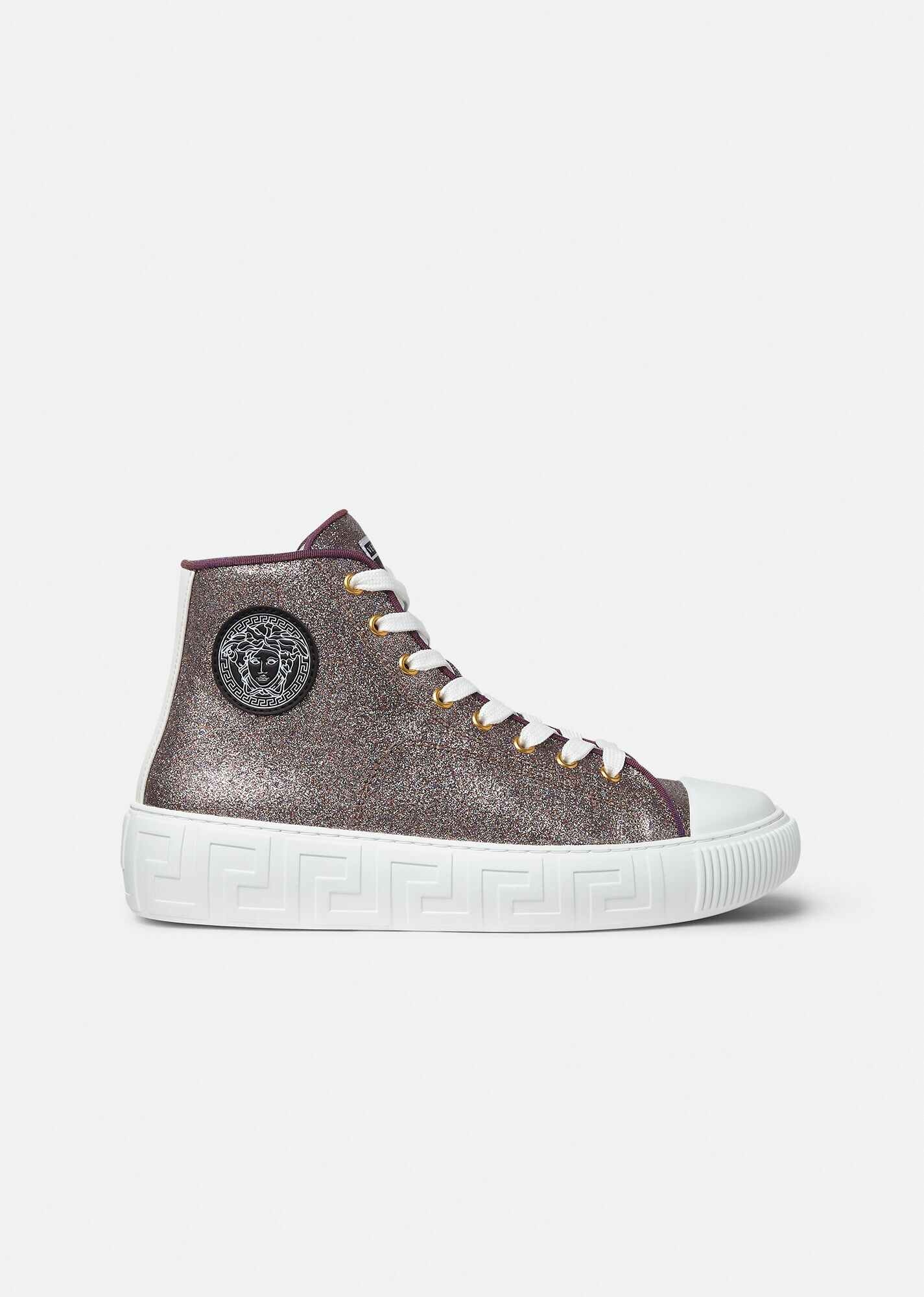The Greca sneaker silhouette is characterized by understated, clean lines and the graphic Greca pattern on the midsole. This high top design is finished in metallic gold leather and features the Medusa on both the outsole and a round patch label. DETAILS & CARE - High top - Lace up - Logo patch on tongue - Round Medusa patch label - Greca pattern midsole - Medusa on outsole - Outer fabric: 100% Rubber - Lining: 100% Calf leather - Sole: 100% Rubber - Trim. 100% Calf leather SIZE & FIT - Fits true to size, take your normal size - All sizes fit Italian standards