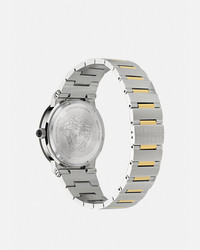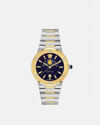 DETAILS The Greca Logo Moonphase watch is detailed with House symbols and geometries, including the Greca motif alternating with a series of decorative screws on the top ring. The dial has a 3D Medusa at 12h and the Versace logo at 6h. The movement is personalised by a Medusa on the moon phase window, and the watch is further enriched by a blue cabochon on the crown. The timepiece is completed with a metal band. All Versace watches are guaranteed by the 'Swiss Made' marking. - Case: Bico (SS&IP2N) case / Greca engraving and six screws on top ring / Black or Blue cabochon - Dial: Blue aventurine dial with moon phase window at 12h / Versace logo at 6h with date window and Medusa at 12h - Bracelet: Bicolour (SS & IP2N) band with Versace logo alternated on links with butterfly buckle - Movement: RONDA 708 Swiss Quartz 3-hands movement with moon phase - Water Resistant: 5 ATM Item: PVE7G002-P0023_RTU_TU_PNUL__ SIZE & FIT - Case: 1.5"