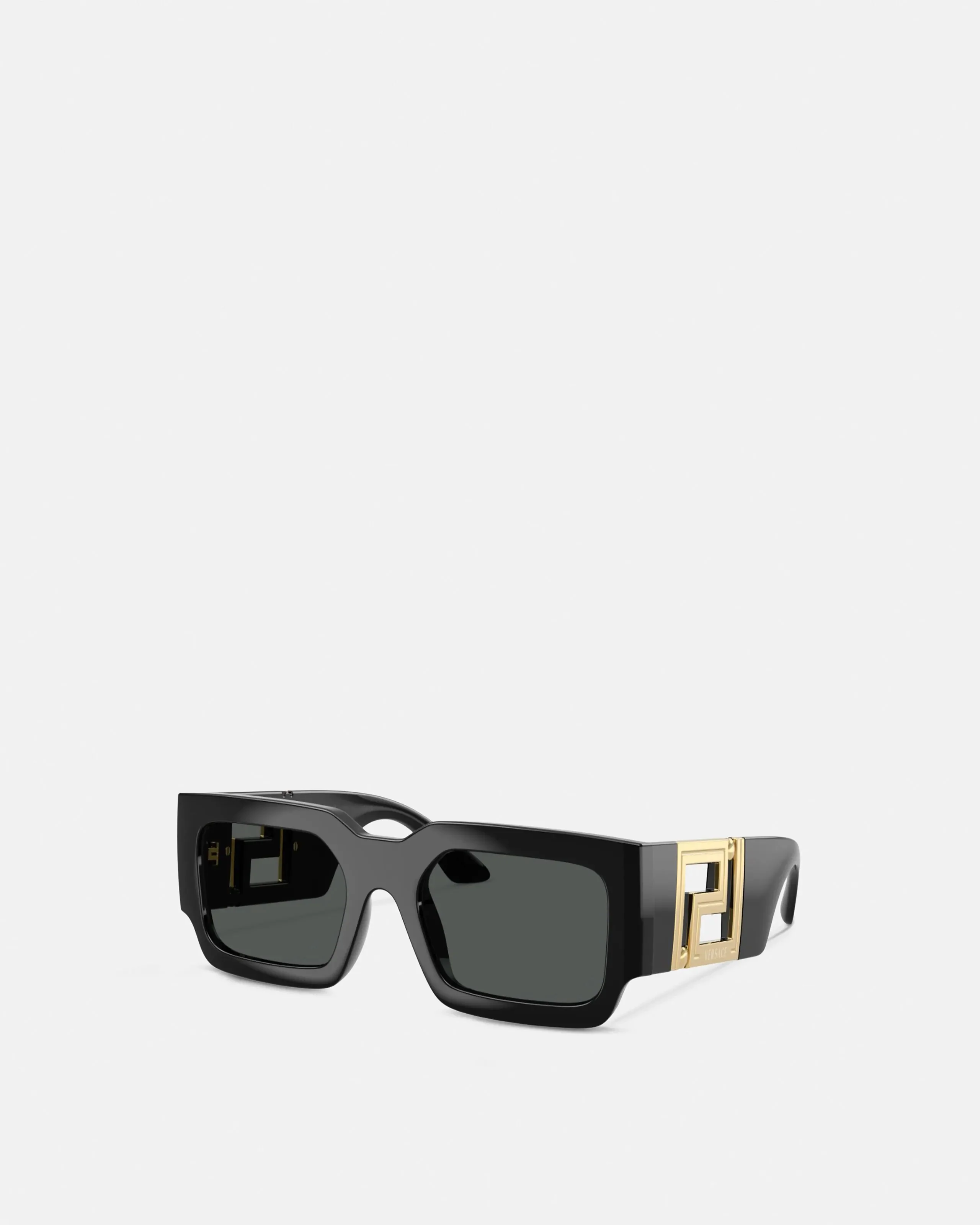 Bold geometric sunglasses featuring a Greca hardware on wide temples and a laser-engraved Versace Logo. - Greca hardware - Engraved Versace Logo - Frame color: black - Temple color: black - Lens color: dark gray - Frame: injected - Temple: injected Size & Fit - Lens: W2.1" x H1.3" / W54 x H32.3 mm - Bridge: 0.8" / 21 mm - Temple: 5.6" / 141 mm Item: O4506U-OGB18754_RTU_TU_ONUL__