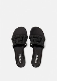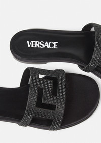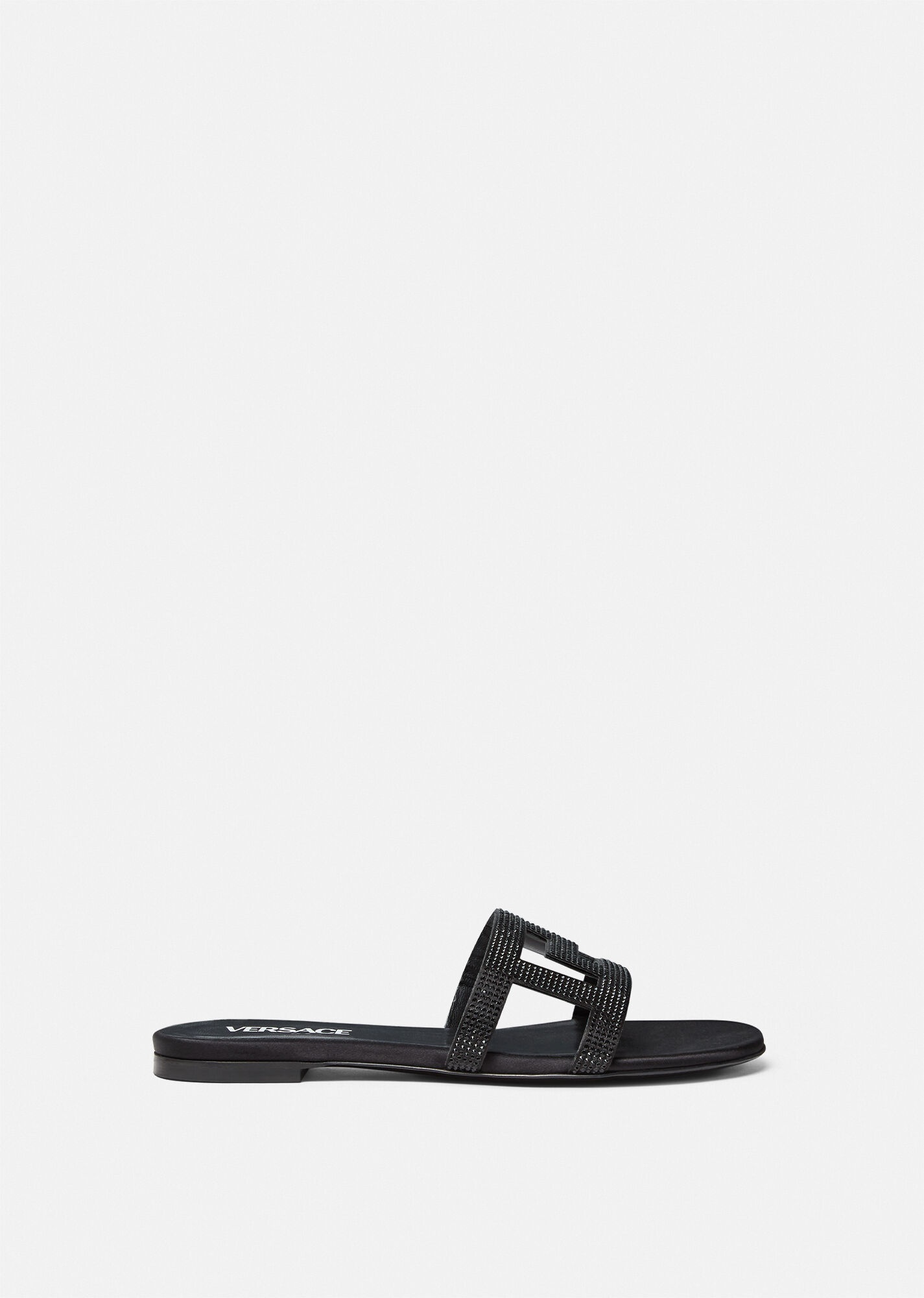 In a satin finish, these flat open-toe sandals feature an openwork crystal-embellished Greca pattern on the front strap in a distinctive labyrinth design. DETAILS & CARE - Greca motif - Crystal embellishments - Round toe - Outer composition: 100% Silk - Lining 1: 100% Lambskin - Lining 2: 100% Goat leather - Trim: 100% Goat leather - Sole: 100% Calf leather SIZE & FIT - All sizes fit Italian standards - Fits true to size, take your normal size - Heel 1 cm
